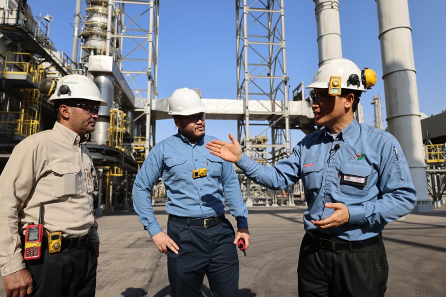 2022年11月27日,在沙特西部城市延布,中沙延布煉廠的員工在交流。總投資86億美元的中沙延布煉廠是中國石化與沙特阿拉伯石油公司合資興建的項(xiàng)目,自2016年1月20日由兩國元首共同啟動投產(chǎn)以來,發(fā)展迅速。今年1月至8月累計(jì)實(shí)現(xiàn)利潤11.5億美元。