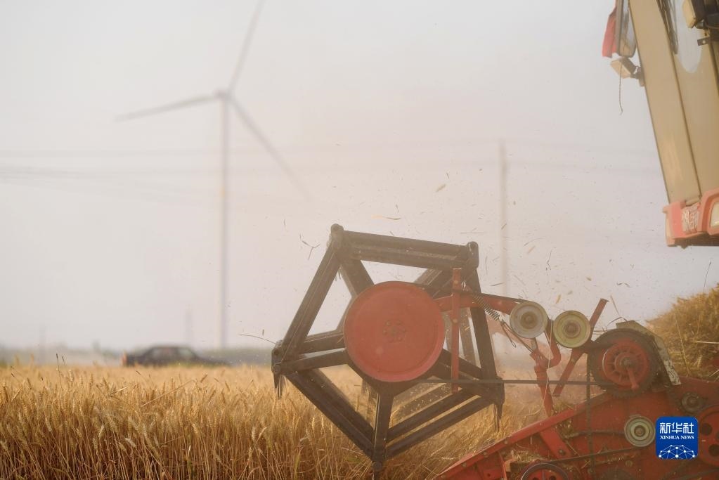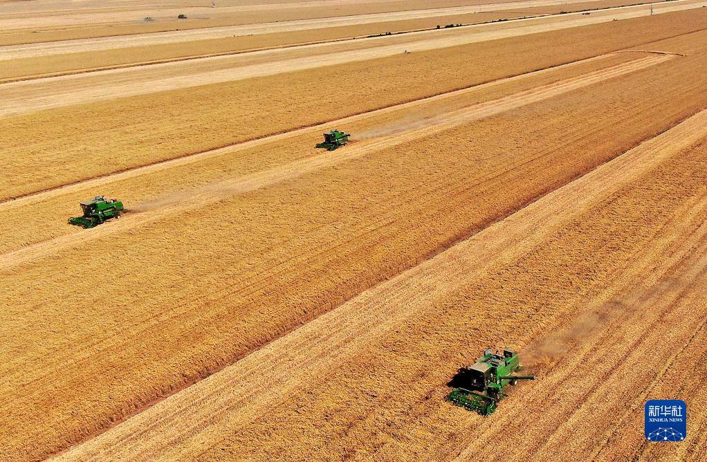 在河南省安陽市湯陰縣菜園鎮(zhèn)高標(biāo)準(zhǔn)農(nóng)田示范區(qū),收割機在麥田作業(yè)(2022年6月8日攝)。新華社記者 郝源 攝
