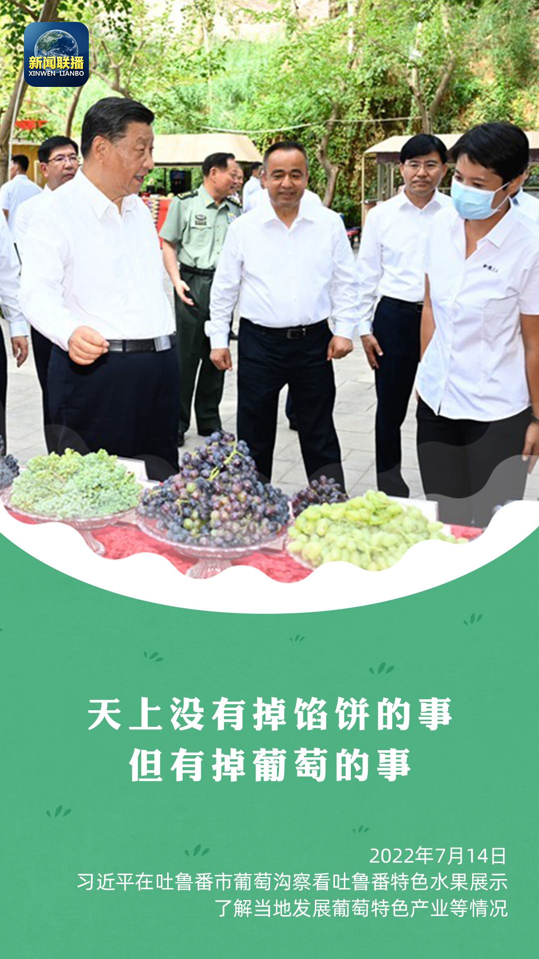 今年7月14日,習(xí)近平來到吐魯番市考察調(diào)研。在葡萄溝,習(xí)近平察看吐魯番特色水果展示。當(dāng)?shù)仄咸哑贩N紛繁,琳瑯滿目。