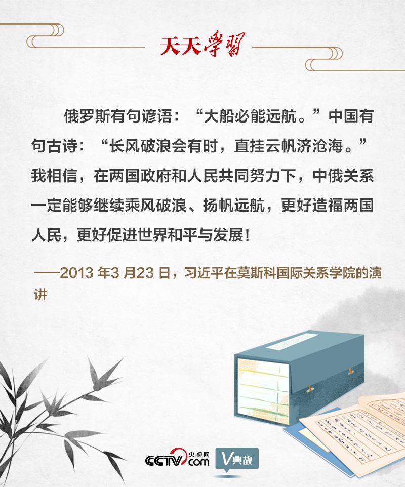 關(guān)于中俄關(guān)系,早在10年前在莫斯科國際關(guān)系學(xué)院的演講中,習(xí)近平主席就有精辟闡述。演講結(jié)束語中,習(xí)主席首先引用一句俄羅斯諺語“大船必能遠(yuǎn)航”,拉近了與俄羅斯民眾的文化空間和心理距離。接著引用了含義相近的中國古詩“長風(fēng)破浪會有時,直掛云帆濟(jì)滄?!保寣Ψ皆谖幕嗨菩灾猩羁填I(lǐng)悟其中道理。最后凝聚共同理念:“中俄關(guān)系一定能夠繼續(xù)乘風(fēng)破浪、揚(yáng)帆遠(yuǎn)航”。