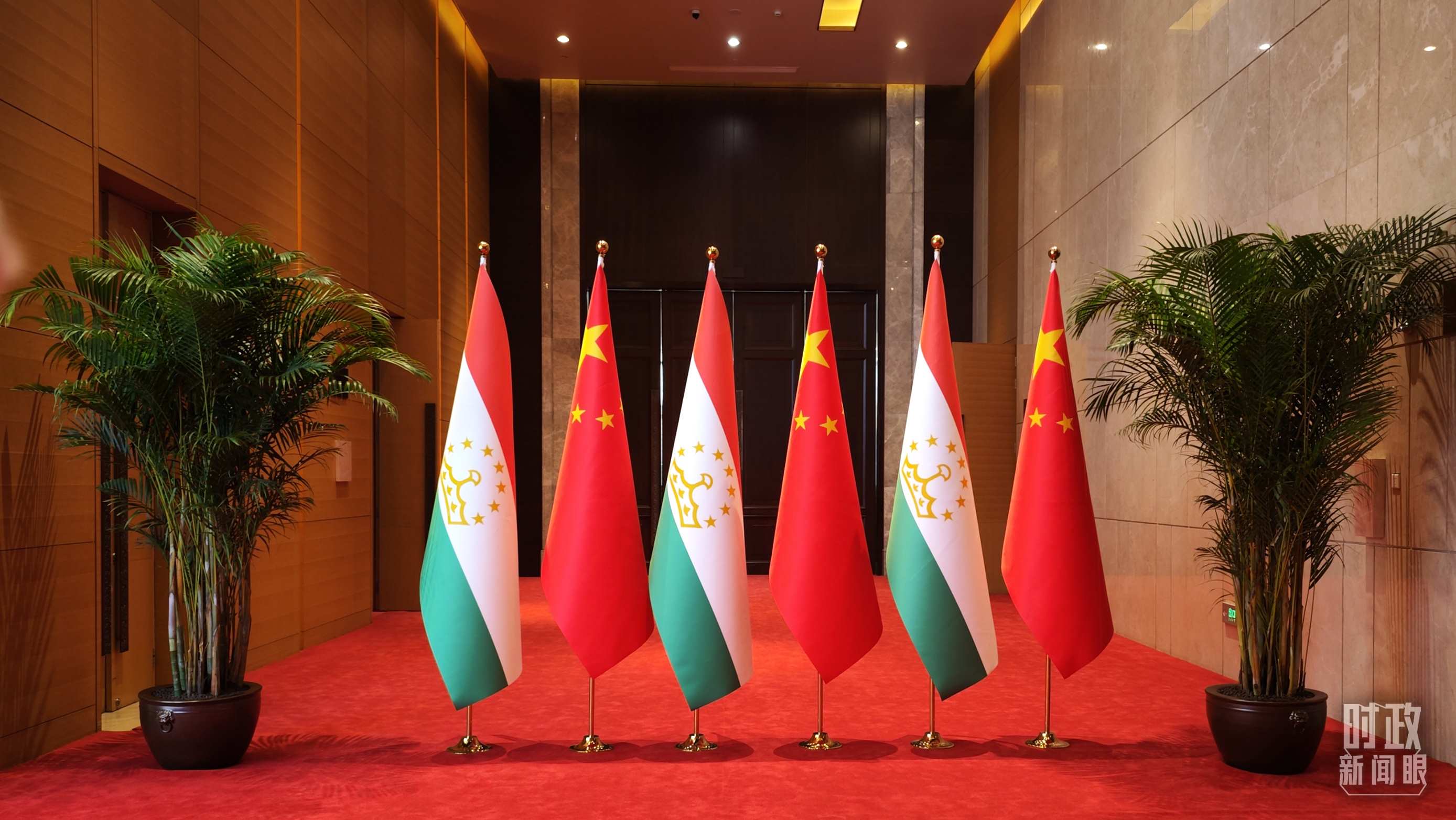 △中塔元首會談現(xiàn)場外布置的兩國國旗。(總臺央廣記者潘毅拍攝)