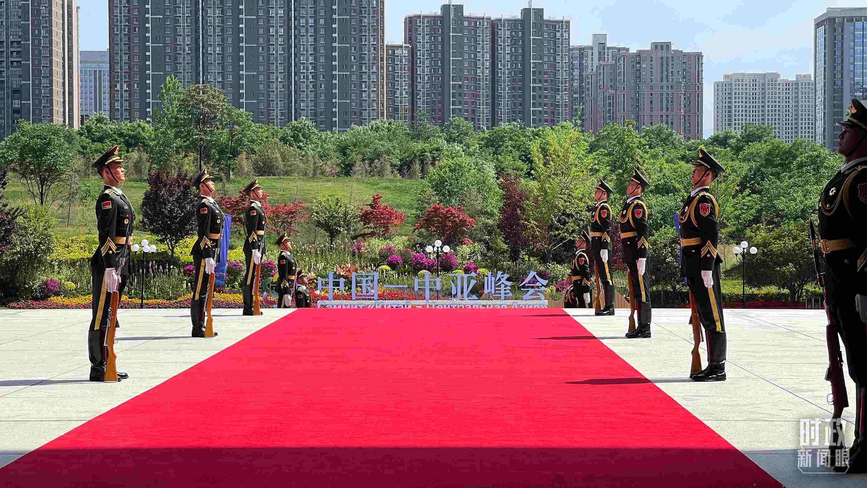 △陜西賓館會議中心外,禮兵列隊迎接貴賓。(總臺央視記者鐘信偉拍攝)