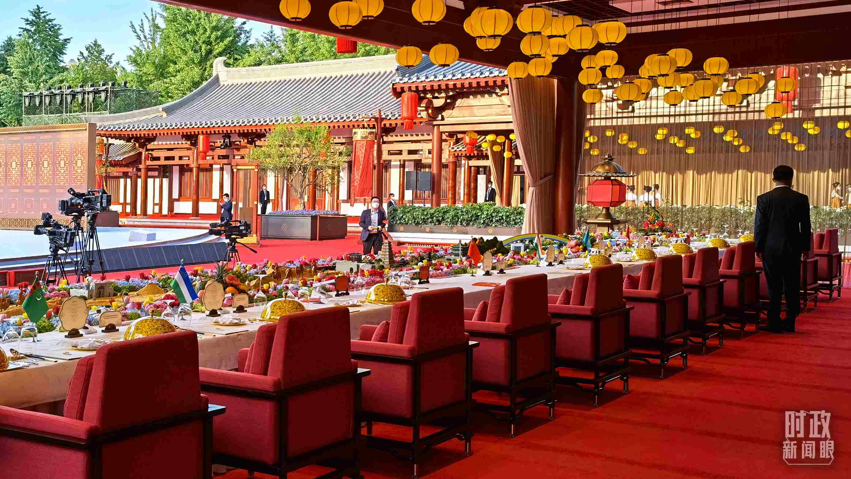 △歡迎晚宴的餐臺設(shè)計融入古絲綢之路和“一帶一路”元素,并穿插中國和中亞五國的標志性建筑,獨具匠心。(總臺央視記者石丞拍攝)