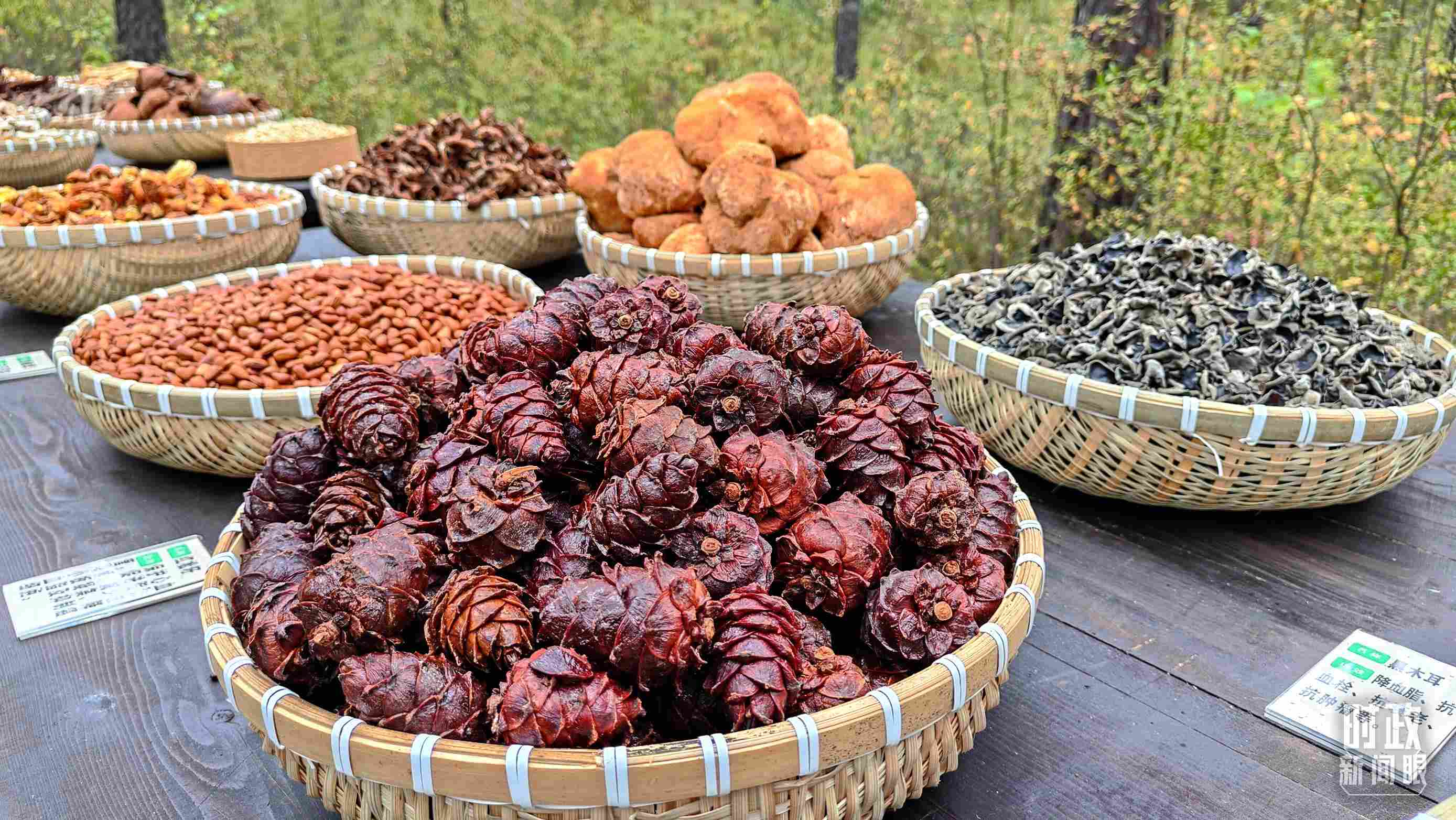 △漠河林場自然林區(qū)的林下作物展示,最靠近鏡頭的是偃松塔。(總臺(tái)央視記者楊立峰拍攝)