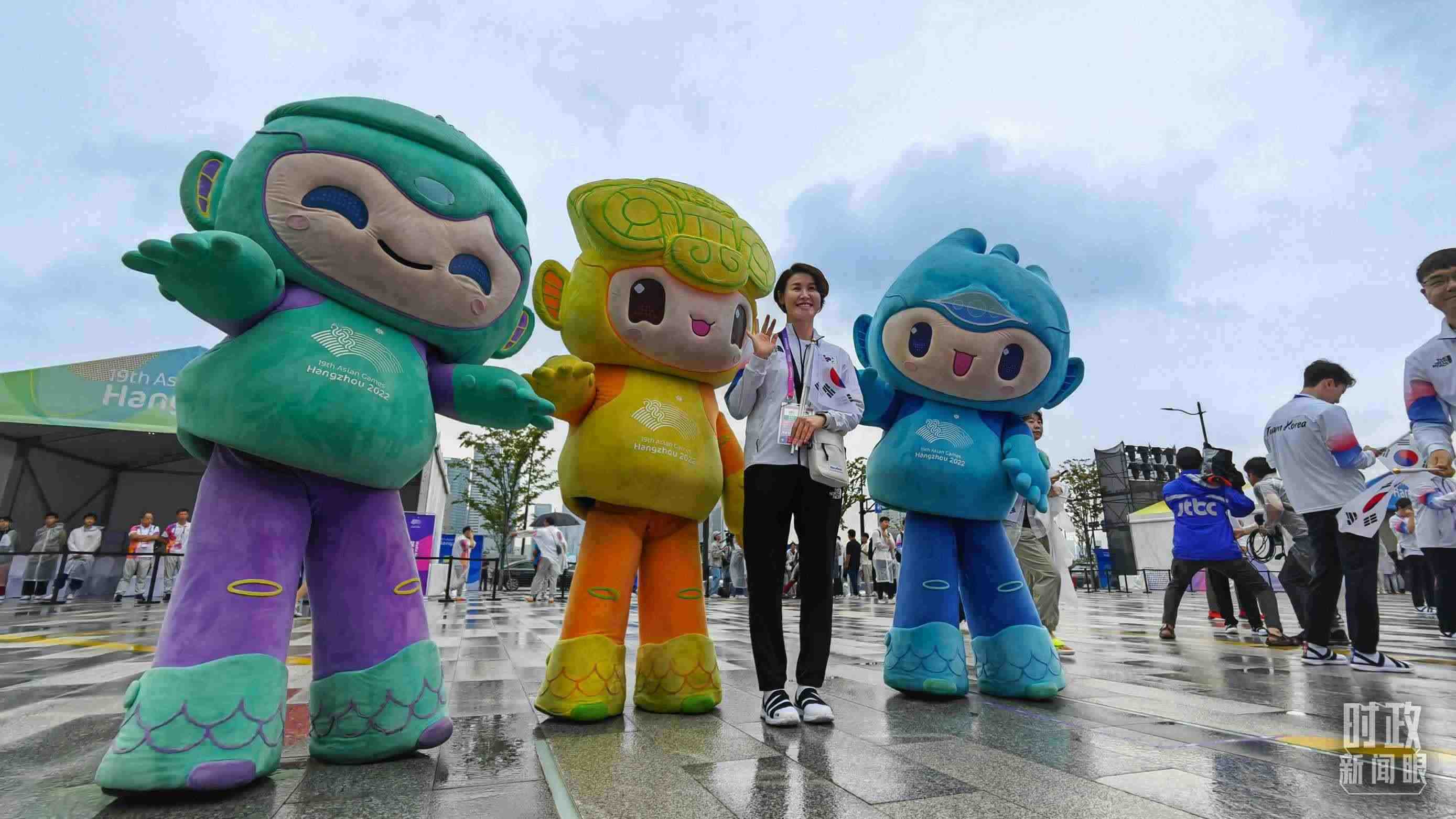 △亞運村為各代表團舉行歡迎儀式,隊員們紛紛與吉祥物“蓮蓮”、“琮琮”、“宸宸”合影。(總臺央視記者陳偉奎拍攝)