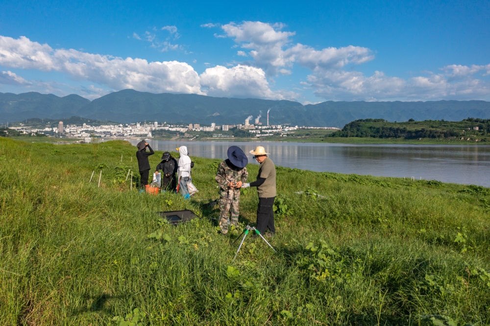 在位于重慶的中國(guó)科學(xué)院三峽庫(kù)區(qū)水土保持與環(huán)境研究站,中國(guó)科學(xué)院成都山地所科研人員在庫(kù)區(qū)消落帶上開展相關(guān)監(jiān)測(cè)(2023年7月5日攝,無(wú)人機(jī)照片)。新華社記者 黃偉 攝