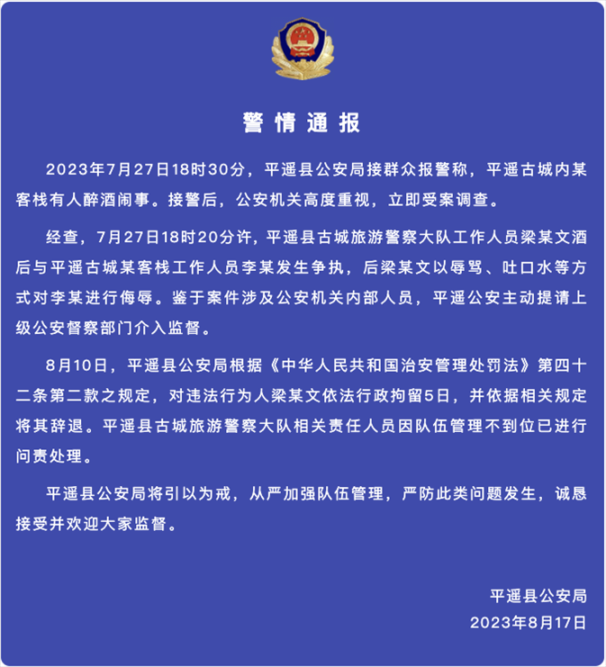 ·山西平遙古城警察酒后毆打辱罵客棧前臺并吐口水,警方:刑拘5日,將其辭退。