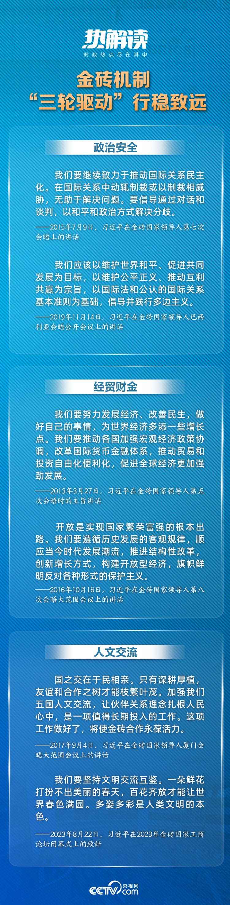 從字母組合的符號(hào)象征到一塊實(shí)打?qū)嵉摹敖鸫u”,回顧金磚合作機(jī)制走過的歷程,習(xí)近平主席倡導(dǎo)的“三輪驅(qū)動(dòng)”合作架構(gòu)為金磚國家合作發(fā)展提供了可行有效的抓手。