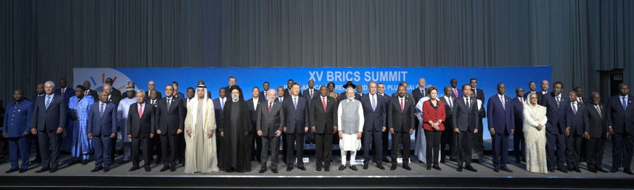 當(dāng)?shù)貢r(shí)間8月23日上午,金磚國家領(lǐng)導(dǎo)人第十五次會(huì)晤在約翰內(nèi)斯堡杉藤會(huì)議中心舉行。南非總統(tǒng)拉馬福薩主持會(huì)晤。中國國家主席習(xí)近平、巴西總統(tǒng)盧拉、印度總理莫迪和俄羅斯總統(tǒng)普京(線上)出席。這是會(huì)晤期間,五國領(lǐng)導(dǎo)人集體合影。新華社記者 李學(xué)仁 攝