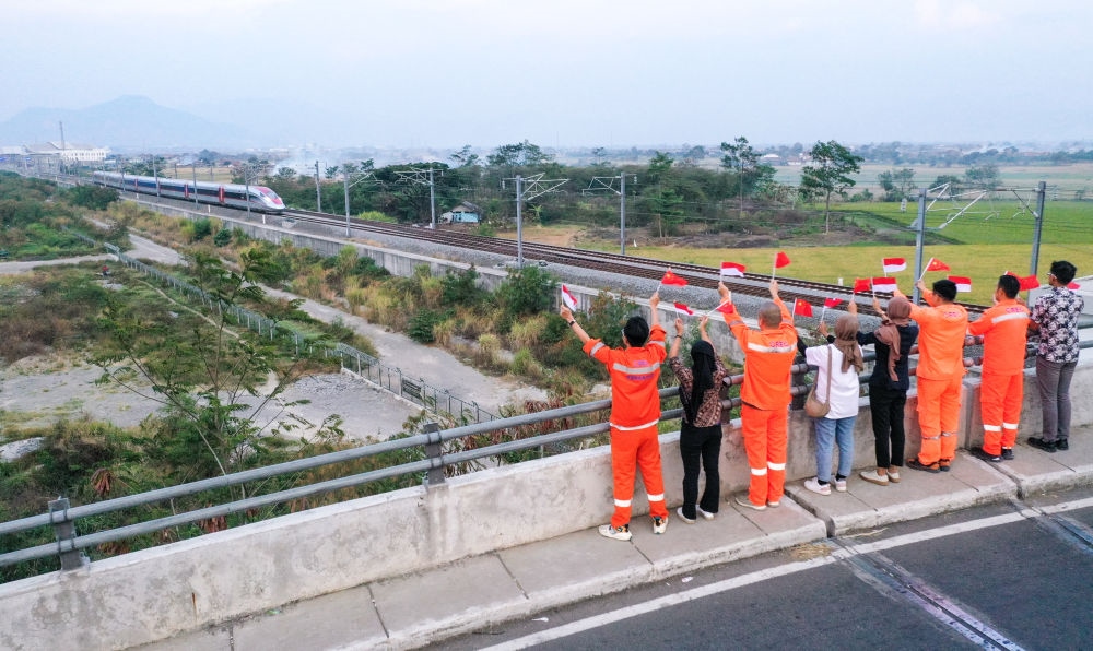 10月17日,在印度尼西亞萬(wàn)隆一座天橋上,雅萬(wàn)高鐵建設(shè)單位之一中鐵電氣化局的中國(guó)和印尼籍員工揮舞著中國(guó)和印尼兩國(guó)國(guó)旗,向遠(yuǎn)處駛來(lái)的一列雅萬(wàn)高鐵高速動(dòng)車(chē)組列車(chē)歡呼(無(wú)人機(jī)照片)。新華社記者 徐欽 攝