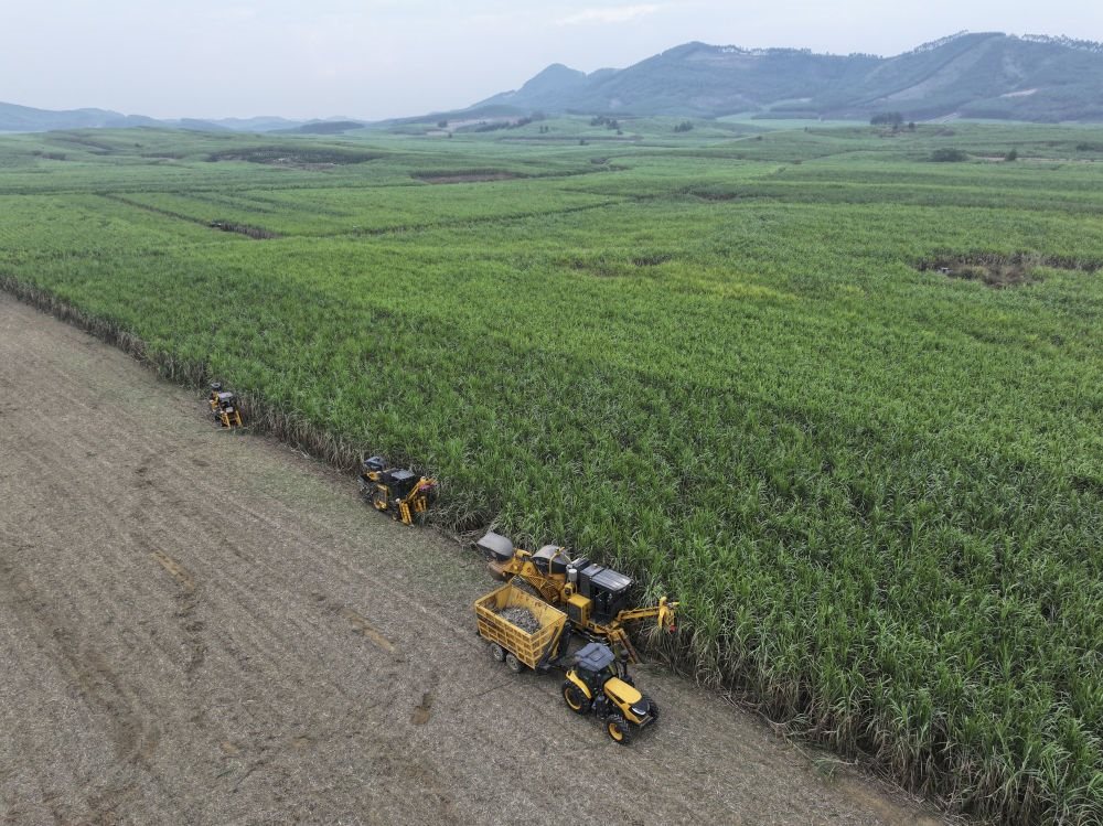 不遠(yuǎn)處,幾臺甘蔗收割機(jī)隆隆作響。當(dāng)?shù)弥笮透收崾崭顧C(jī)一天能收割180噸至200噸甘蔗,相當(dāng)于180個人工的工作量,總書記連連稱贊。