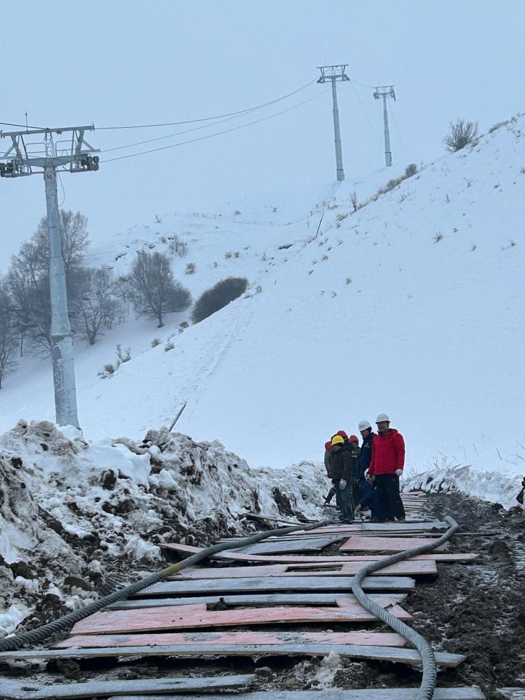 近處,幾十臺設(shè)備轟鳴著同時(shí)開工;遠(yuǎn)處,行吊車來回忙碌,將成形的索道部件擺放至組裝工位處;工人們正手持電焊槍,將雪場索道零部件組焊在一起。