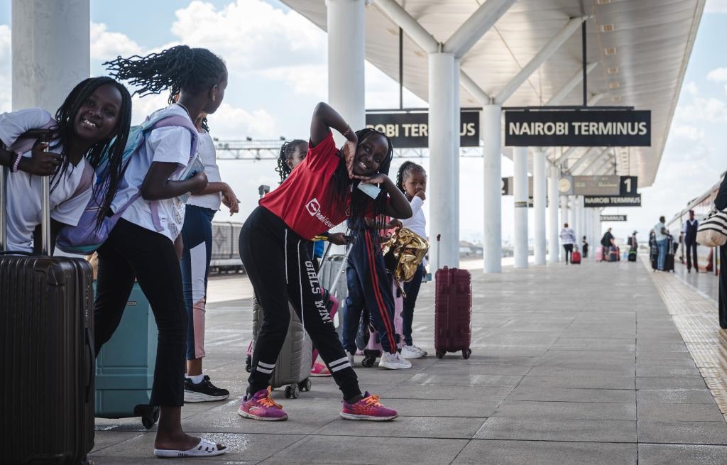 2023年10月6日,兒童在肯尼亞內(nèi)羅畢的蒙內(nèi)鐵路內(nèi)羅畢站內(nèi)等待登車。