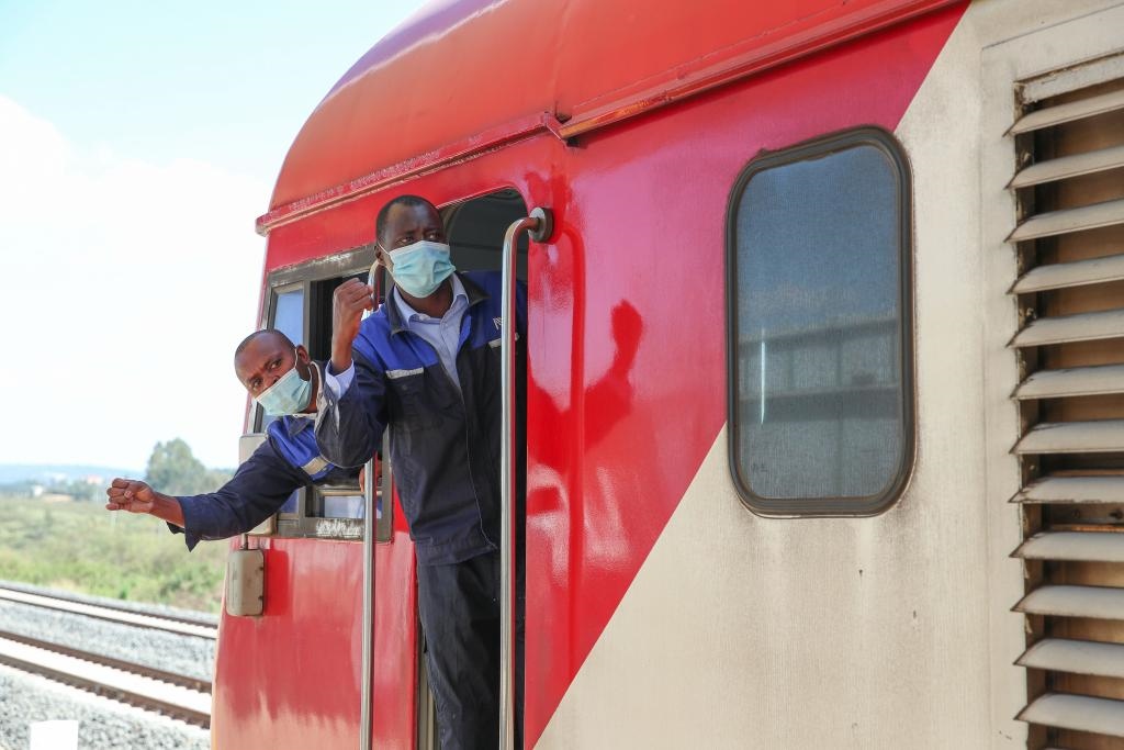 2022年3月25日,在肯尼亞內(nèi)羅畢,蒙內(nèi)鐵路肯方機(jī)車獨立班組成員與站臺工作人員確認(rèn)安全。