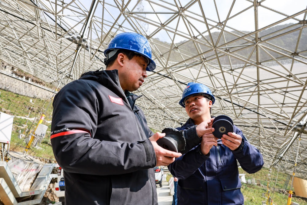 2023年2月13日,姜鵬(左)在貴州“中國天眼”的反射面板下與工作人員交談(維護保養(yǎng)期間拍攝)。新華社記者 歐東衢 攝