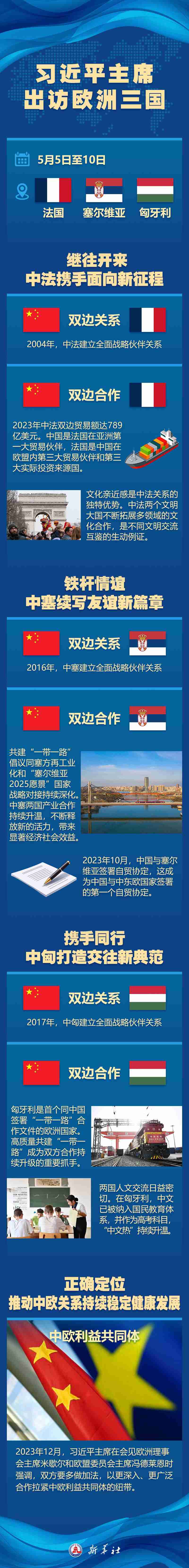 應(yīng)法蘭西共和國(guó)總統(tǒng)馬克龍、塞爾維亞共和國(guó)總統(tǒng)武契奇、匈牙利總統(tǒng)舒尤克和總理歐爾班邀請(qǐng),國(guó)家主席習(xí)近平將于5月5日至10日對(duì)上述三國(guó)進(jìn)行國(guó)事訪問。訪問期間,習(xí)近平主席將同法國(guó)、塞爾維亞、匈牙利領(lǐng)導(dǎo)人為雙邊關(guān)系、中歐關(guān)系健康發(fā)展指引方向,為拓展深化互利合作注入動(dòng)力。一起來看↓↓↓