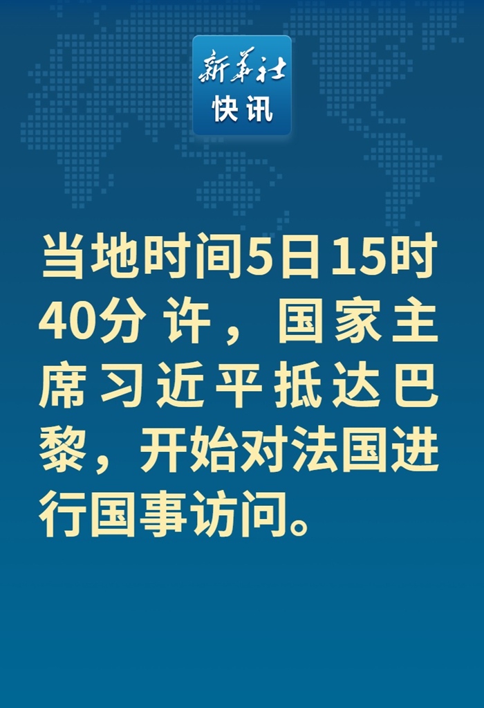 新華社快訊:當(dāng)?shù)貢r(shí)間5日15時(shí)40分許,國(guó)家主席習(xí)近平抵達(dá)巴黎,開(kāi)始對(duì)法國(guó)進(jìn)行國(guó)事訪問(wèn)。