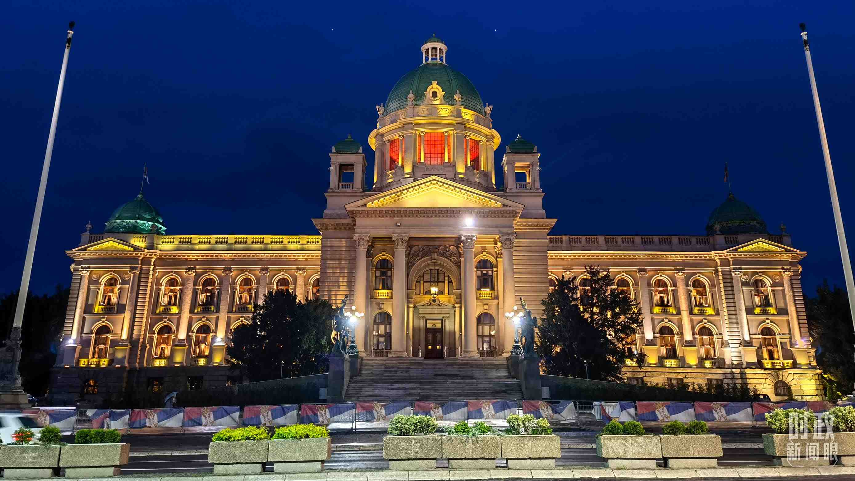 △塞爾維亞國(guó)會(huì)大廈亮起紅燈,歡迎習(xí)主席到訪。(總臺(tái)央視記者石丞拍攝)