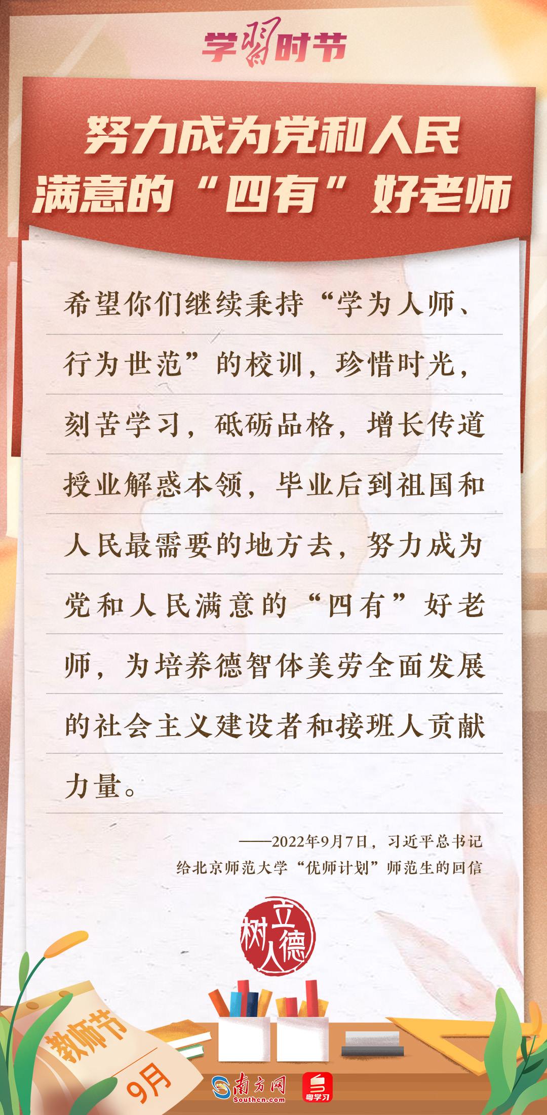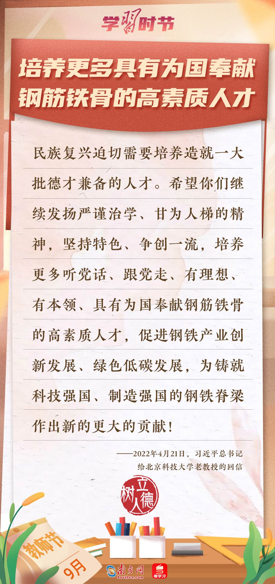 “百年大計(jì),教育為本。教育大計(jì),教師為本?!秉h的十八大以來,習(xí)近平總書記多次以書信形式向教師群體和教育工作者表達(dá)囑托與期望,諄諄話語,催人奮進(jìn)。在第四十個(gè)教師節(jié)到來之際,讓我們一起重溫總書記的諄諄寄語!