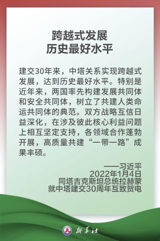 中國和塔吉克斯坦山水相連,兩國人民友好交往源遠流長。中塔建交30年多來,兩國關系取得跨越式發(fā)展,達到全面戰(zhàn)略伙伴關系的歷史性高度。塔方最早同中方簽署共建“一帶一路”合作倡議,雙方率先建立發(fā)展共同體和安全共同體。