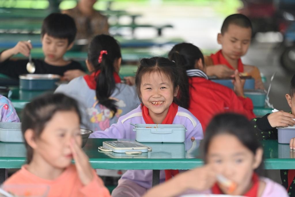 5月31日,廣西柳州市柳江區(qū)三都鎮(zhèn)覺(jué)山教學(xué)點(diǎn),學(xué)生們?cè)诔誀I(yíng)養(yǎng)午餐。