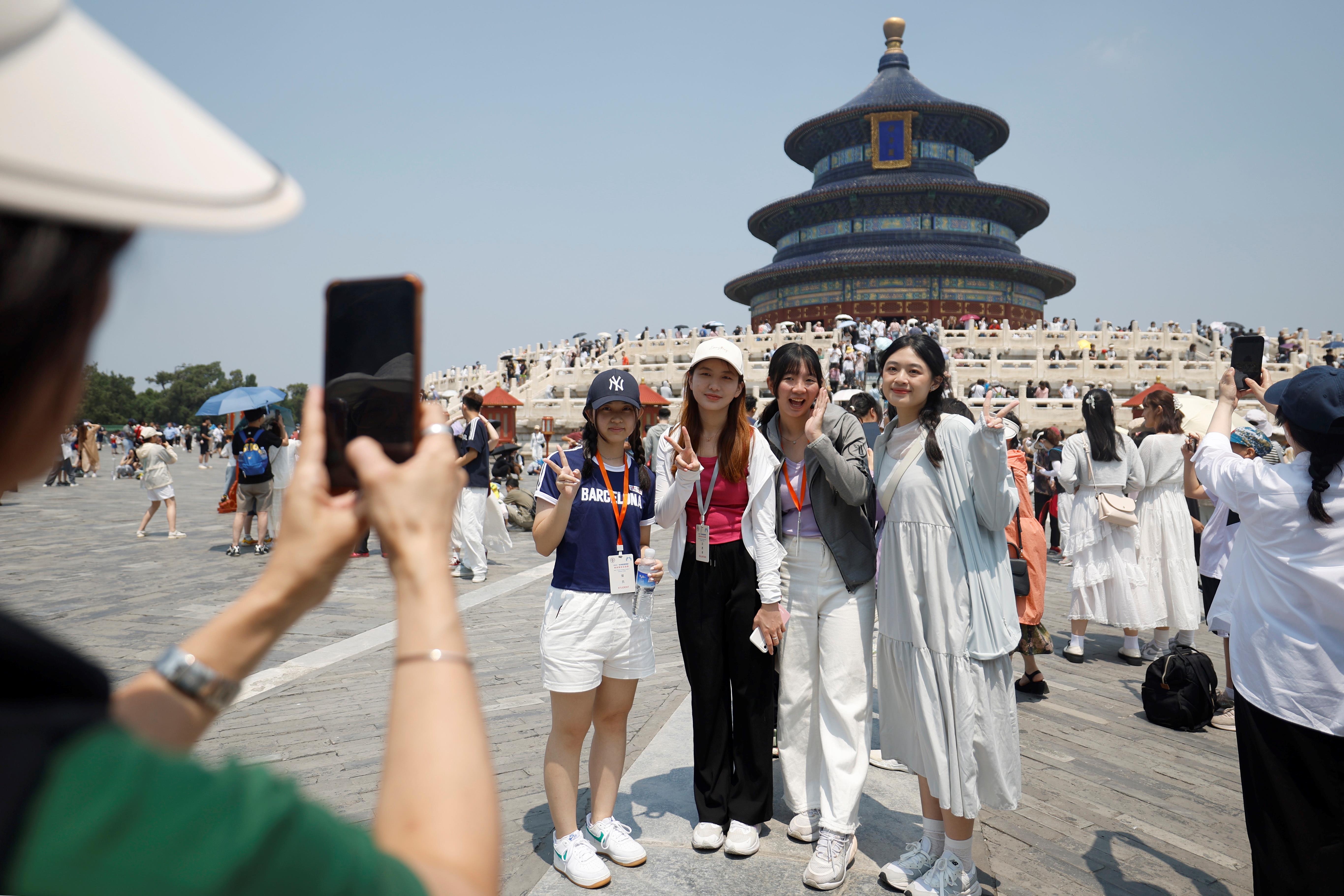 △2024年7月3日,臺灣青年在天壇公園拍照留念。當(dāng)日,2024“未來能源領(lǐng)袖”兩岸青年交流營的營員參觀游覽北京的奧林匹克公園、天壇公園等地。
