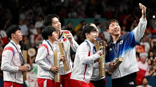 △巴黎奧運會乒乓球混合雙打頒獎儀式結(jié)束后,中朝韓運動員聚到一起合影的場景,在朋友圈刷了屏。