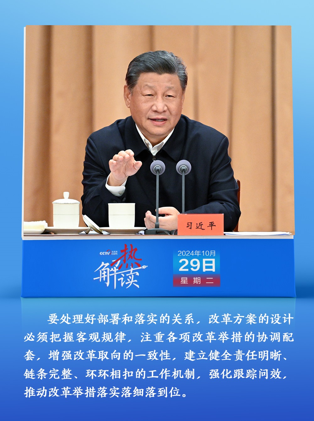 10月29日,省部級主要領(lǐng)導(dǎo)干部學(xué)習(xí)貫徹黨的二十屆三中全會(huì)精神專題研討班開班。在開班式上,習(xí)近平總書記明確提出要“處理好部署和落實(shí)的關(guān)系”,“建立健全責(zé)任明晰、鏈條完整、環(huán)環(huán)相扣的工作機(jī)制,強(qiáng)化跟蹤問效,推動(dòng)改革舉措落實(shí)落細(xì)落到位”。
