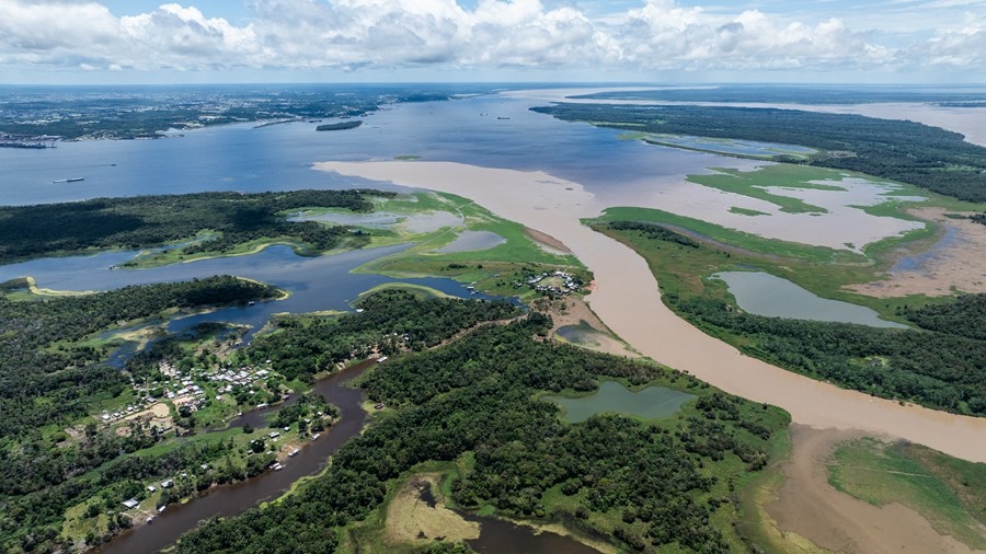 這是2024年3月14日在巴西亞馬孫州首府馬瑙斯附近拍攝的亞馬孫河流域風(fēng)光(無(wú)人機(jī)照片)。新華社記者 王天聰 攝