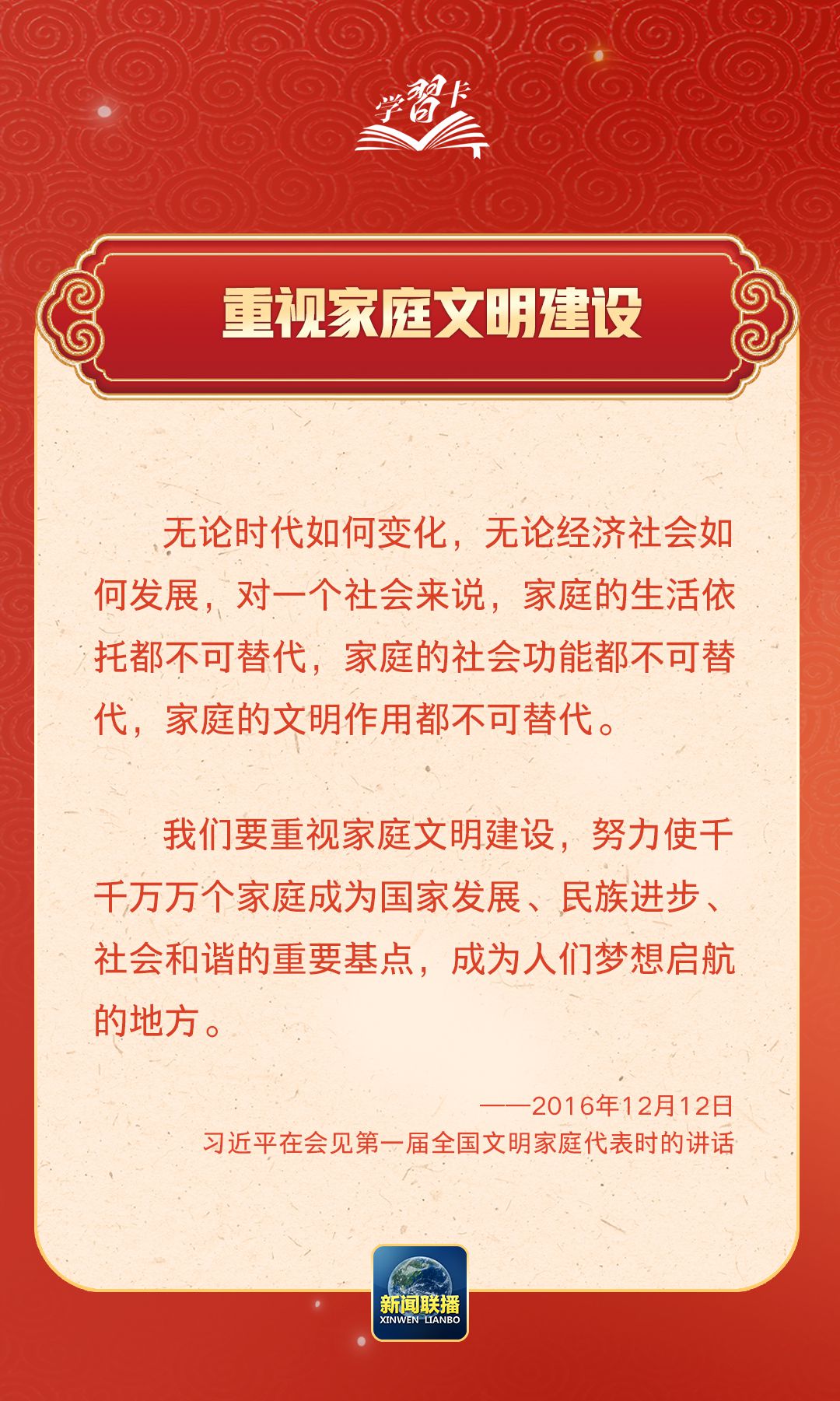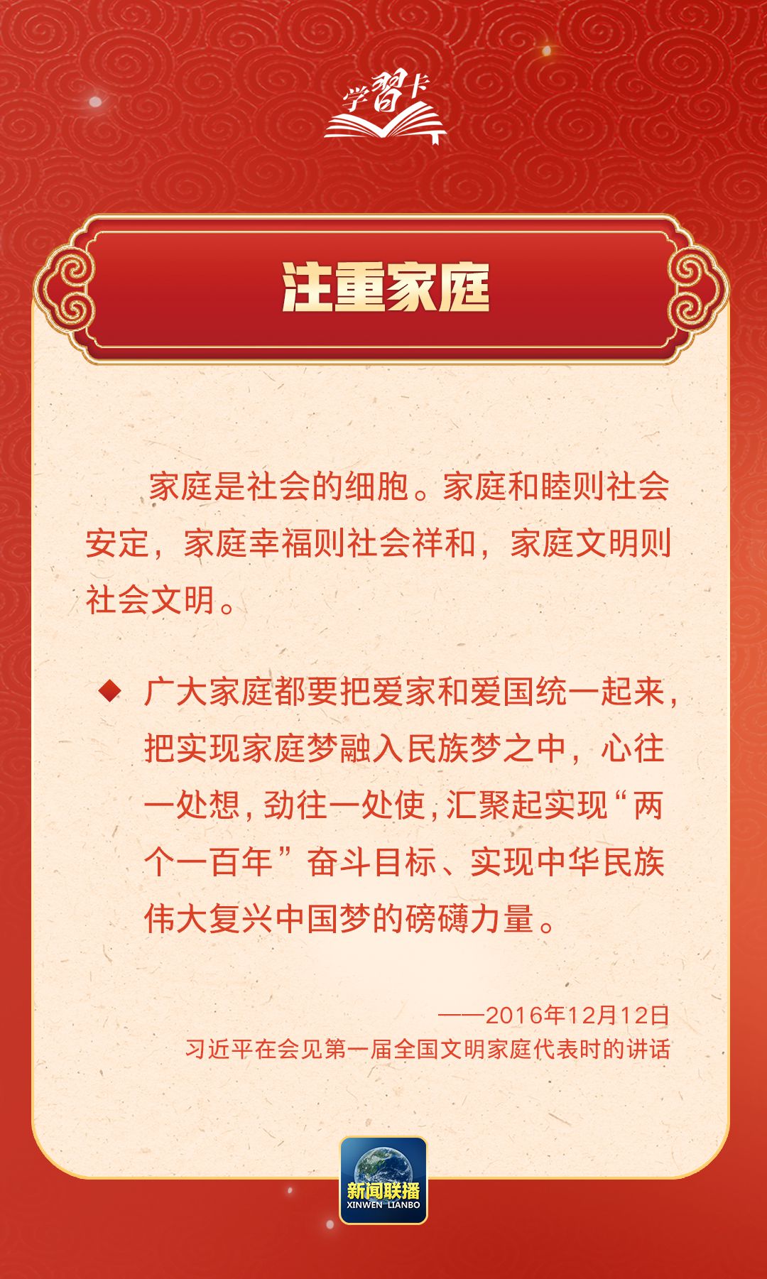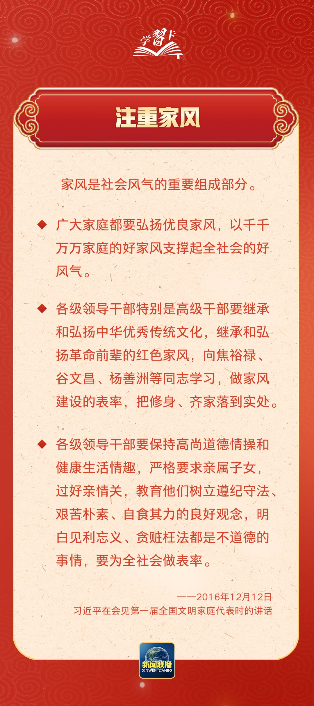 在習近平總書記心中,家國的分量很重。他多次強調要重視家庭建設,提倡愛家愛國相統(tǒng)一,指出廣大家庭都要弘揚優(yōu)良家風,以千千萬萬家庭的好家風支撐起全社會的好風氣。近日,《求是》雜志發(fā)表習近平總書記重要文章《注重家庭,注重家教,注重家風》,一起學習↓