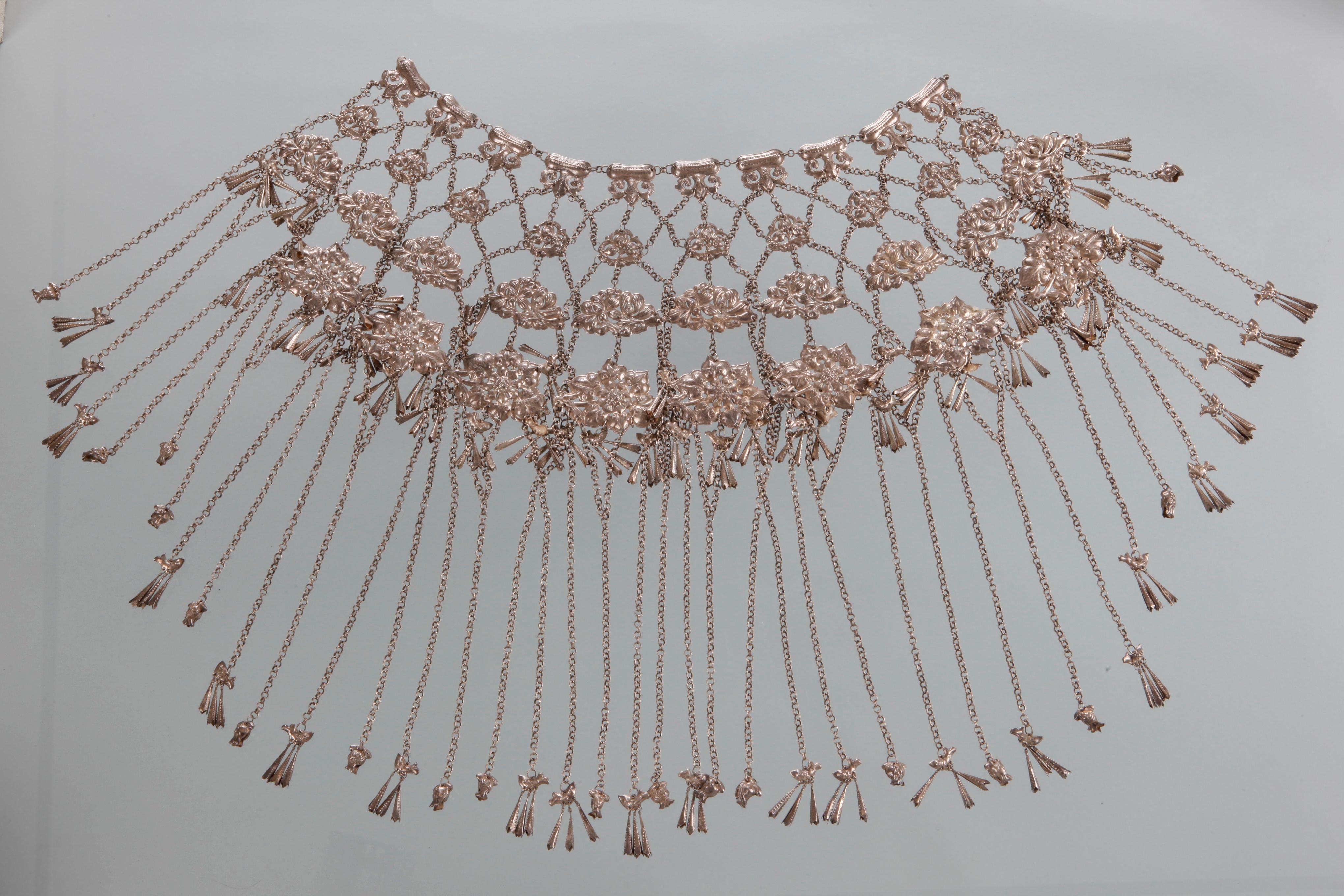花草 、動(dòng)物等吉祥圖案的4排銀牌相綴連