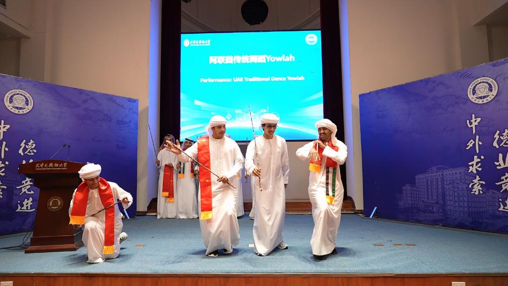 4月7日,在天津外國語大學(xué)舉辦的開班儀式上,阿聯(lián)酋學(xué)生現(xiàn)場表演傳統(tǒng)舞蹈。新華社記者 胡震澤 攝