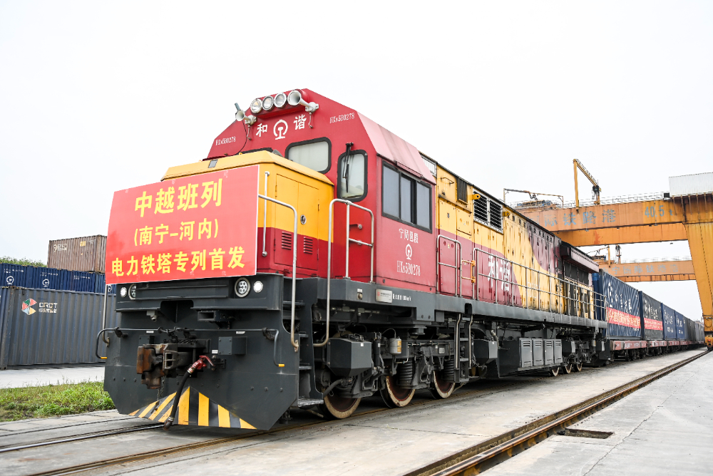 2024年3月8日,在廣西南寧國(guó)際鐵路港,電力鐵塔專(zhuān)列準(zhǔn)備發(fā)車(chē)。當(dāng)日,一列滿(mǎn)載340噸電力鐵塔的中越班列從南寧國(guó)際鐵路港開(kāi)出,發(fā)往越南河內(nèi)。新華社記者 曹祎銘 攝