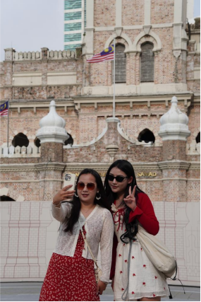 兩名來自中國云南的游客在馬來西亞首都吉隆坡地標性歷史建筑蘇丹阿卜杜勒·薩馬德大廈前合影。人民日報記者 俞懿春攝