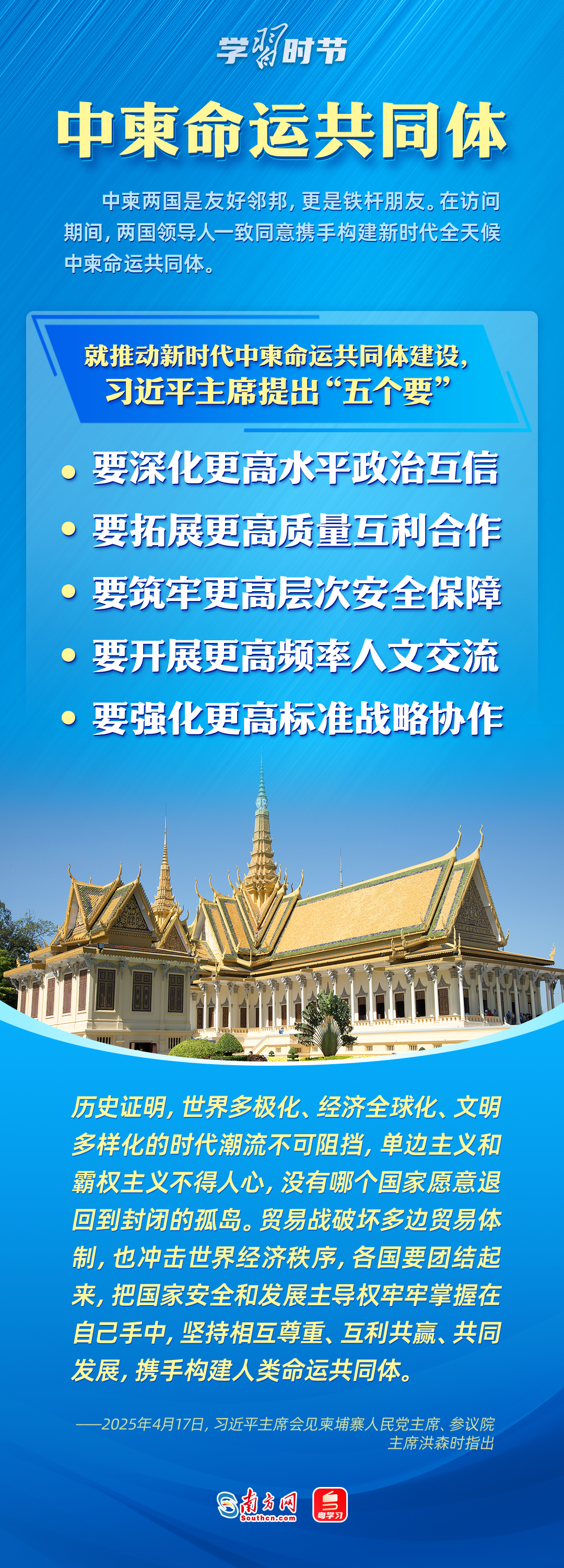 日前,中央周邊工作會議召開,強調(diào)要聚焦構建周邊命運共同體,努力開創(chuàng)周邊工作新局面。4月14日至18日,習近平主席出訪東南亞三國——越南、馬來西亞、柬埔寨。這是習近平主席今年首次出訪,對推動中國同三國關系發(fā)展具有重大意義,也為周邊命運共同體建設擘畫了新藍圖。