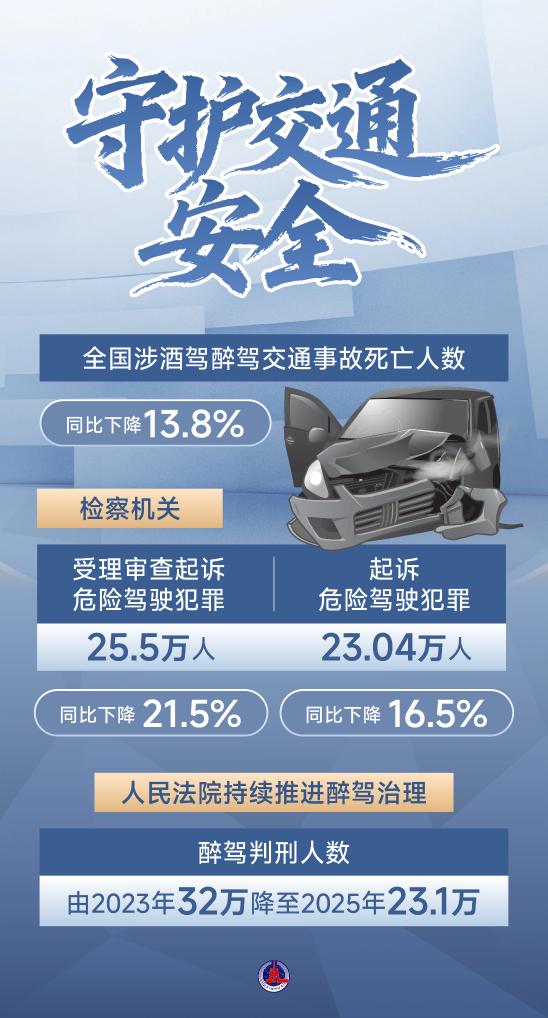 最高法報告指出,辦理醉駕刑事案件意見出臺后,判刑人數(shù)由2023年32萬降至2025年23.1萬,因酒駕造成交通事故及致死、致傷數(shù)量均有下降。同時,明確“駕駛?cè)俗砭坪髥⒂幂o助駕駛功能仍應(yīng)承擔(dān)刑事責(zé)任”?! ?/p>