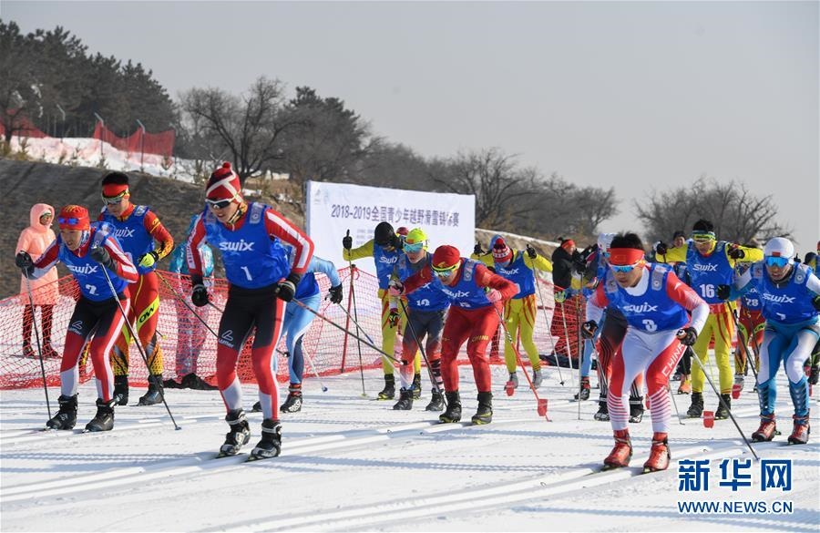 1月12日,參賽選手在青年組男子30公里集體出發(fā)(自由技術(shù))比賽中出發(fā)。1月11日至1月15日,2018-2019年度全國青少年越野滑雪錦標(biāo)賽在內(nèi)蒙古烏蘭察布市涼城縣岱?;﹫雠e行。新華社記者彭源攝