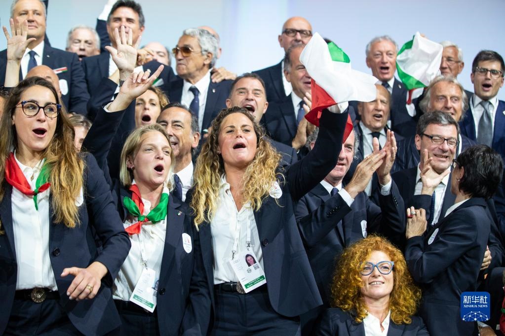 2019年6月24日,意大利米蘭/科爾蒂納丹佩佐申冬奧代表團(tuán)成員慶祝獲得2026年冬奧會(huì)舉辦權(quán)。新華社記者徐金泉攝