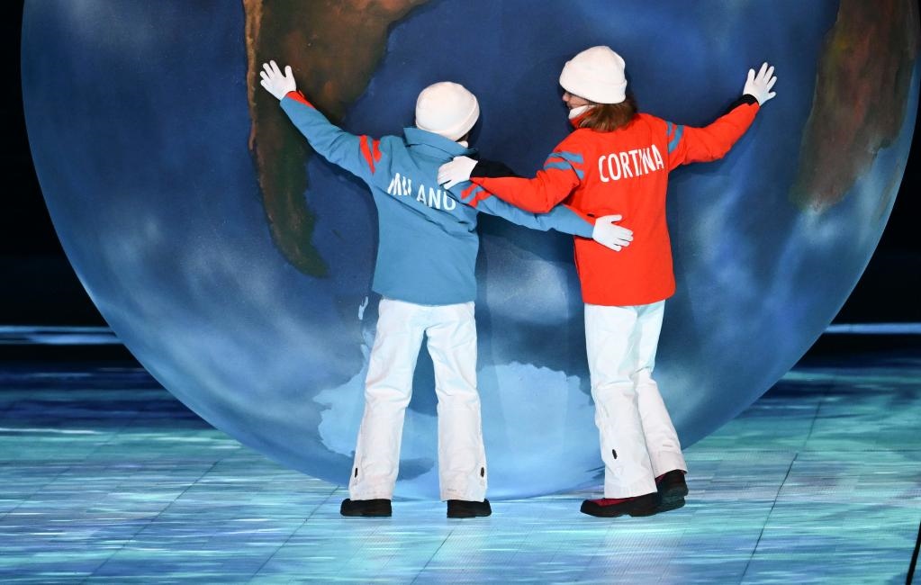 循著場(chǎng)地邊緣一道亮光,兩位意大利小朋友推動(dòng)手工制作的地球走向中央。下一屆冬奧會(huì)舉辦地八分鐘表演“雙城璧合·聚力聯(lián)輝”拉開序幕。四年后,活力四射的時(shí)尚之都米蘭將攜手山川環(huán)繞的科爾蒂納丹佩佐,共襄冬奧盛會(huì)。山川與城市、自然與建筑相互映照,在共舞中寄寓著人類和自然間的彼此尊重、相互對(duì)話。