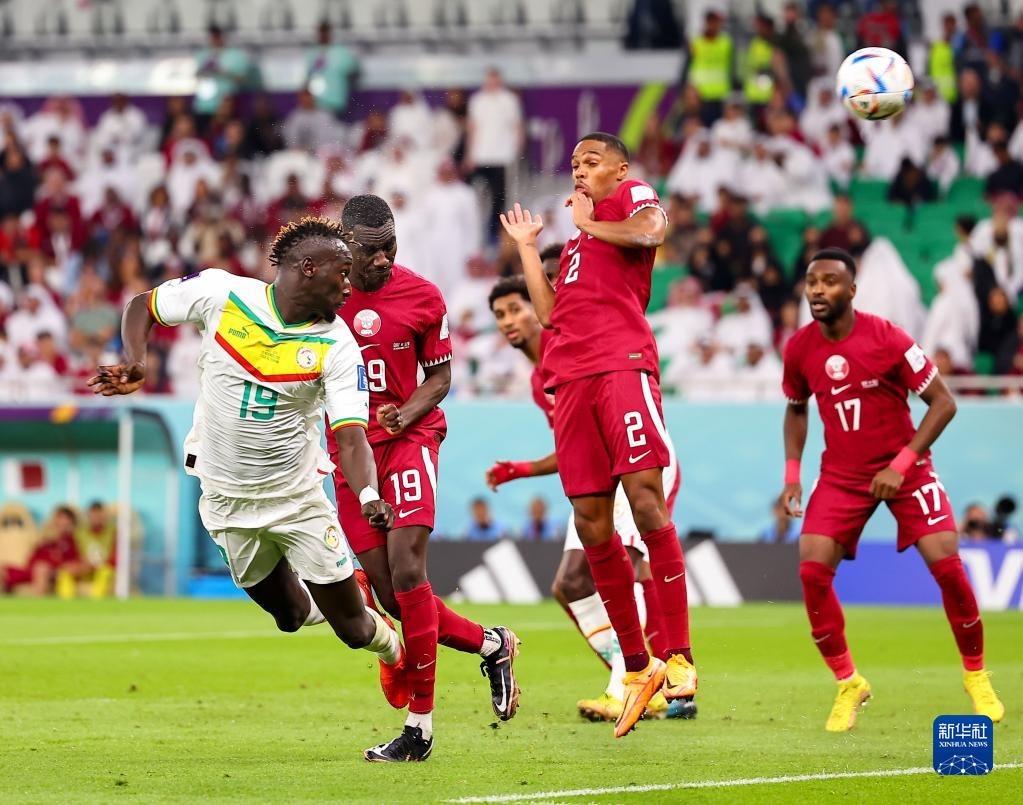11月25日,塞內(nèi)加爾隊球員迪德希歐(左一)頭球破門,取得球隊第二粒進(jìn)球。新華社記者 丁旭 攝