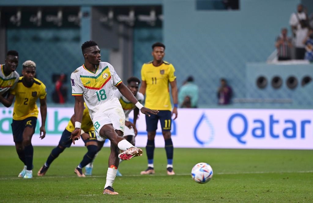 11月29日,塞內(nèi)加爾隊(duì)球員伊斯梅拉·薩爾(前)在比賽中主罰點(diǎn)球破門。新華社記者 陳誠(chéng) 攝