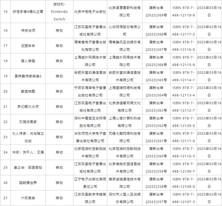 人民網(wǎng)北京3月21日電 (記者楊虞波羅)據(jù)國家新聞出版署官網(wǎng)消息,3月20日,2023年進(jìn)口網(wǎng)絡(luò)游戲?qū)徟畔⒄桨l(fā)布,共27款游戲獲得游戲版號,其中包含22款移動(dòng)游戲、3款PC游戲、1款雙端游戲、1款NS游戲機(jī)游戲。