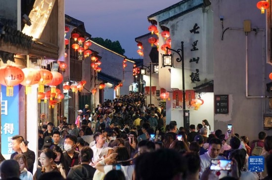 游客在江蘇蘇州山塘街休閑游玩(4月10日攝)。