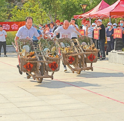 山東省棗莊市山亭區(qū)山城街道靈芝湖社區(qū),村民參加農(nóng)民運(yùn)動(dòng)會(huì)“運(yùn)糧”項(xiàng)目比賽。劉明祥攝(人民視覺(jué))