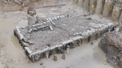 朔門古港遺址位于溫州古城北大門——朔門之外,南依古城,北鄰甌江,東靠海壇山,隔江與江心嶼雙塔遙相呼應(yīng)。2021年10月,溫州望江路下穿隧道施工過程中發(fā)現(xiàn)遺跡線索,工程立即停工。2022年,經(jīng)浙江省文物考古研究所與溫州市文物考古研究所聯(lián)合發(fā)掘,發(fā)現(xiàn)了分別建于宋元和明清的朔門甕城遺跡,實證千年以來岸線變遷的江堤、橋梁、陡門閘、棧道等建筑遺跡,還有8座宋代碼頭、2艘宋代沉船,以及數(shù)以噸計的宋元瓷片堆積和形式各樣的漆木器等遺物,年代主要集中于宋元時期。800年前溫州古港“城腳千家具舟楫,江心雙塔壓濤波”的繁華景象,重現(xiàn)于人們眼前。