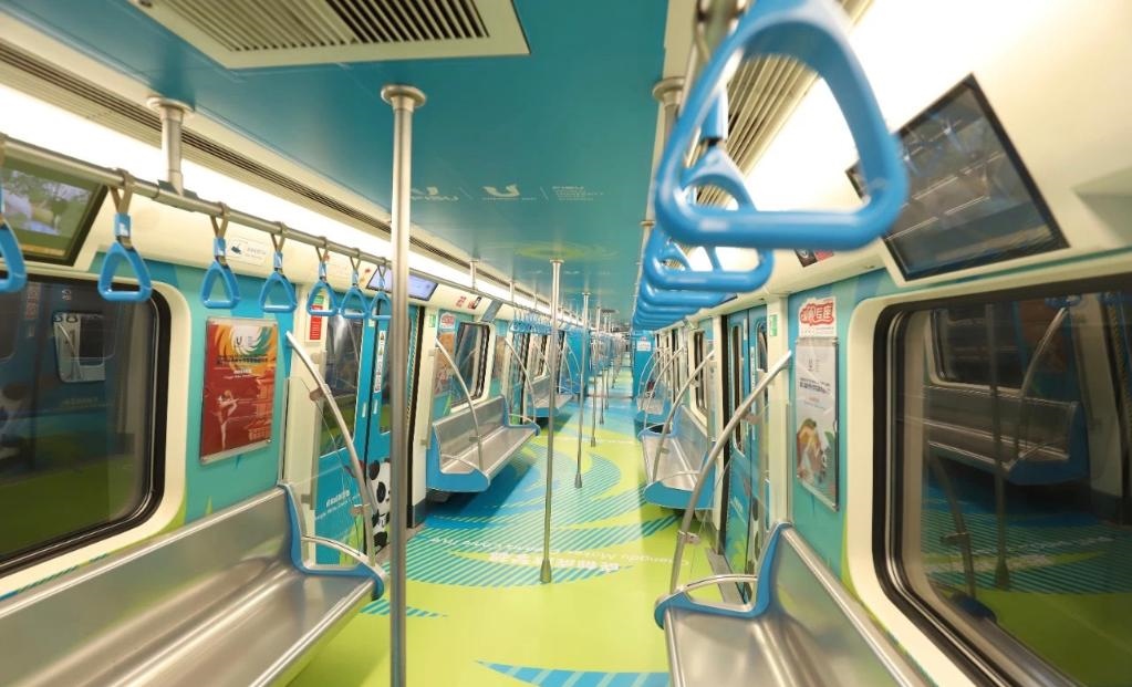 整體車廂打造創(chuàng)新植入了色彩明快、充滿青春氣息的“移動運動場”概念,立面畫面則結合青春動感的大學生形象,并選用田徑、網(wǎng)球、籃球、體操等運動的代表性動作為設計元素,全面凸顯成都大運會賽事核心主題。