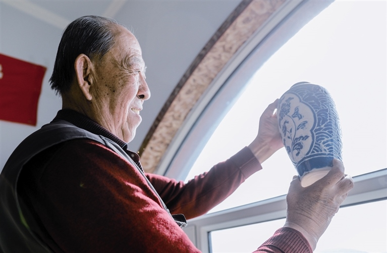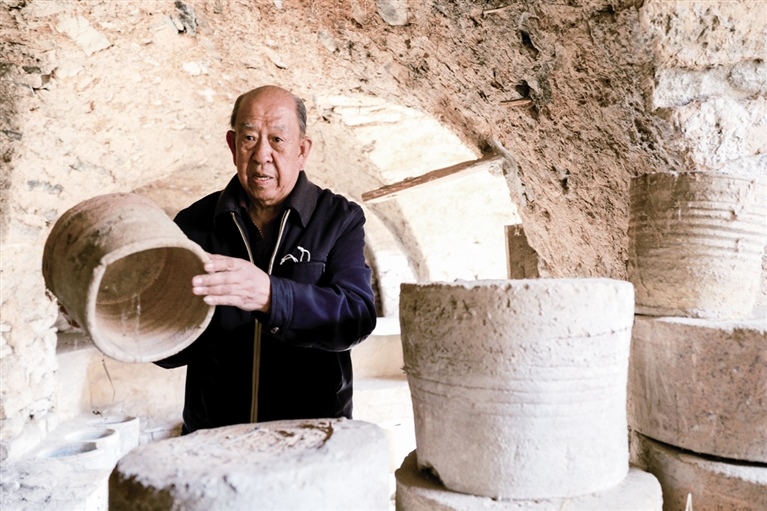隨后,他走進(jìn)“饅頭窯”旁邊的一口窯洞,這是當(dāng)時(shí)張家的一間手工作坊,揉泥、拉坯、上釉等一系列制作陶瓷的工序都是在這里完成?!拔揖统錾谶@個(gè)村子,已經(jīng)是張家瓷藝的第九代傳人了。作為中國磁州窯譜系,清水河黑礬溝瓷藝生產(chǎn)歷史至少已有800年?!标P(guān)于這項(xiàng)非遺的歷史故事,張選老人向記者娓娓道來:大約400年前,他們張家走西口從山西來到清水河謀生,當(dāng)時(shí)清水河黑礬溝有一家姓杜的人家做陶瓷營生,張家的先人在杜家打工,大概這樣打工做了三輩人吧,杜家忽然不做了,搬離了黑礬溝,他們張家便把杜家的產(chǎn)業(yè)買了下來繼續(xù)做?!澳莻€(gè)時(shí)候黑礬溝生產(chǎn)的瓷器都與人們生活息息相關(guān),比如腌菜缸、水甕、碗盤等,一個(gè)家庭手工作坊一天能生產(chǎn)500個(gè)碗呢,生意很好,人們靠做這個(gè)營生也過上了不錯(cuò)的生活?!睆堖x回憶著清水河瓷藝鼎盛時(shí)期的場(chǎng)景。上個(gè)世紀(jì)70年代,由于交通、技術(shù)等原因,黑礬溝燃燒了幾百年的窯火熄滅,傳統(tǒng)“饅頭窯”被正式廢棄,轉(zhuǎn)移到窯溝鄉(xiāng)后手工作坊變成了機(jī)械化生產(chǎn),這也讓清水河的陶瓷名聲大噪。當(dāng)時(shí),在窯溝鄉(xiāng)一帶,從事陶瓷生產(chǎn)的有近萬人,陶瓷業(yè)成為清水河支柱產(chǎn)業(yè)。