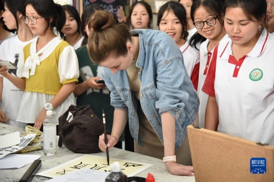 6月5日,參加三都高級中學第一屆國際文化節(jié)的來華留學生學習書寫水族文字。