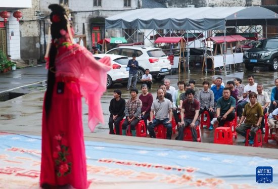 6月25日,澧浦鎮(zhèn)鄭店村百姓在觀看光南文化禮堂大舞臺(tái)上婺之靈坐唱班表演的婺?。o(wú)人機(jī)照片)。