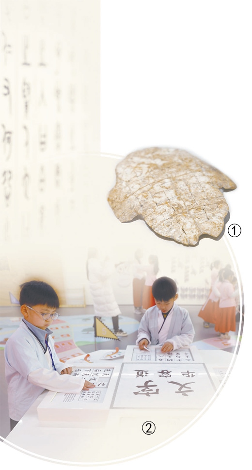 圖①:中國文字博物館館藏的卜甲。 丁俊豪攝(影像中國) 圖②:學(xué)生在博物館體驗“文字華容道”游戲。楊少甜攝